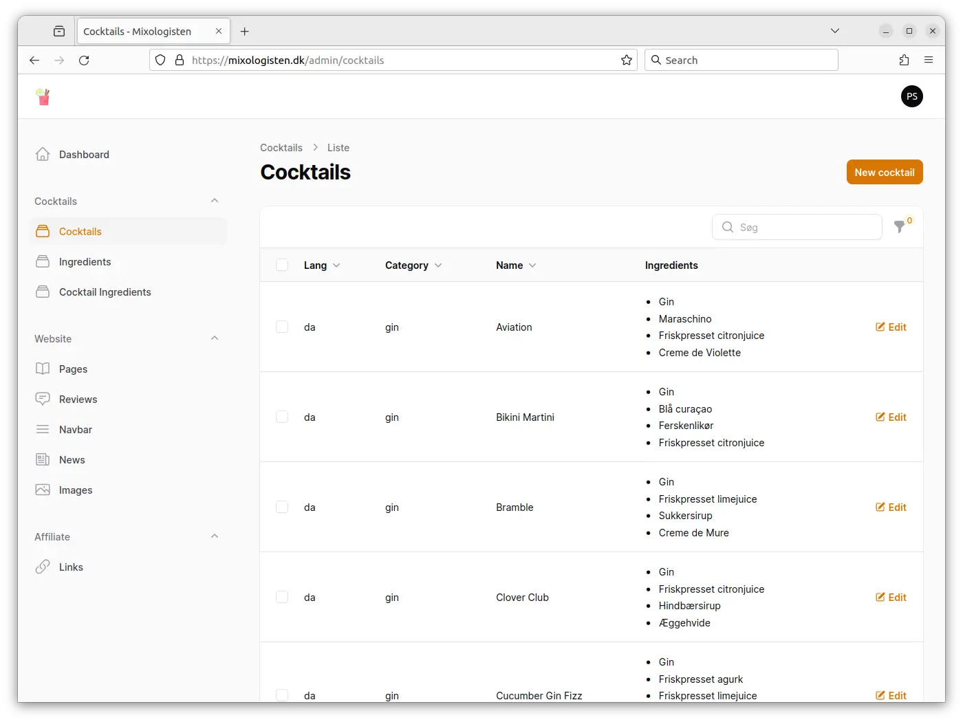 Til Mixologisten lavede vi et administrationspanel, der gør det muligt at oprette, redigere og slette alle elementer på hjemmesiden. Ejeren har fuld kontrol af indholdet: