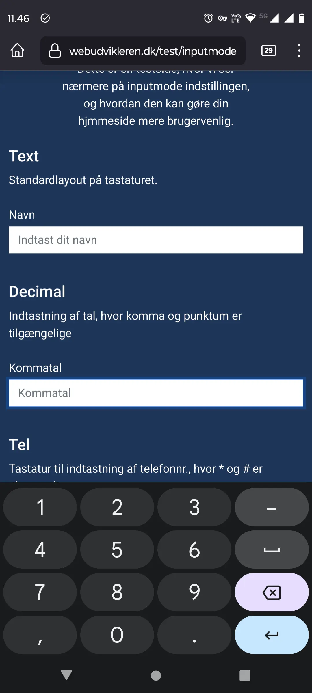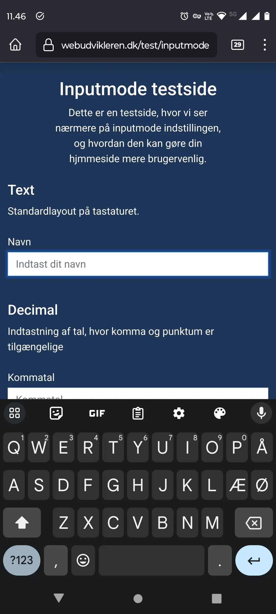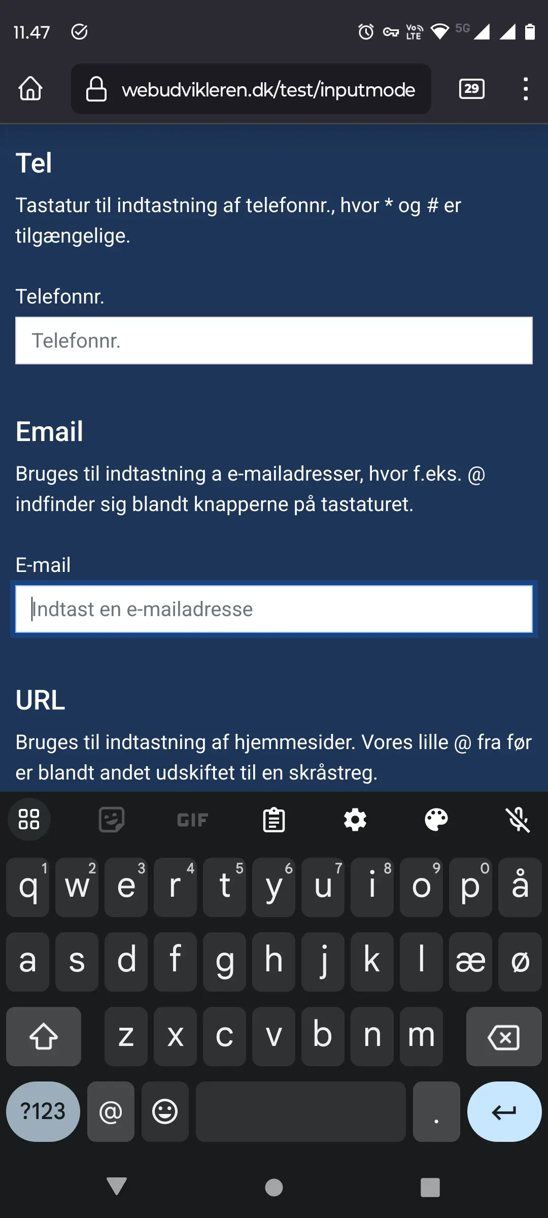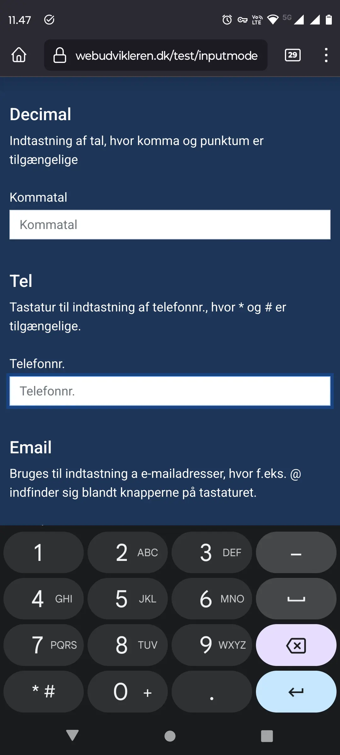 Der findes i alt 8 forskellige inputmodes og dermed tastaturlayouts at vælge imellem. Herunder gennemgår vi de mest brugte, hvor du — hvis du er på en mobilenhed — kan prøve dem af. Har du lyst til at vide endnu mere, anbefaler vi Mozilla’s tekniske beskrivelse af inputmode.
