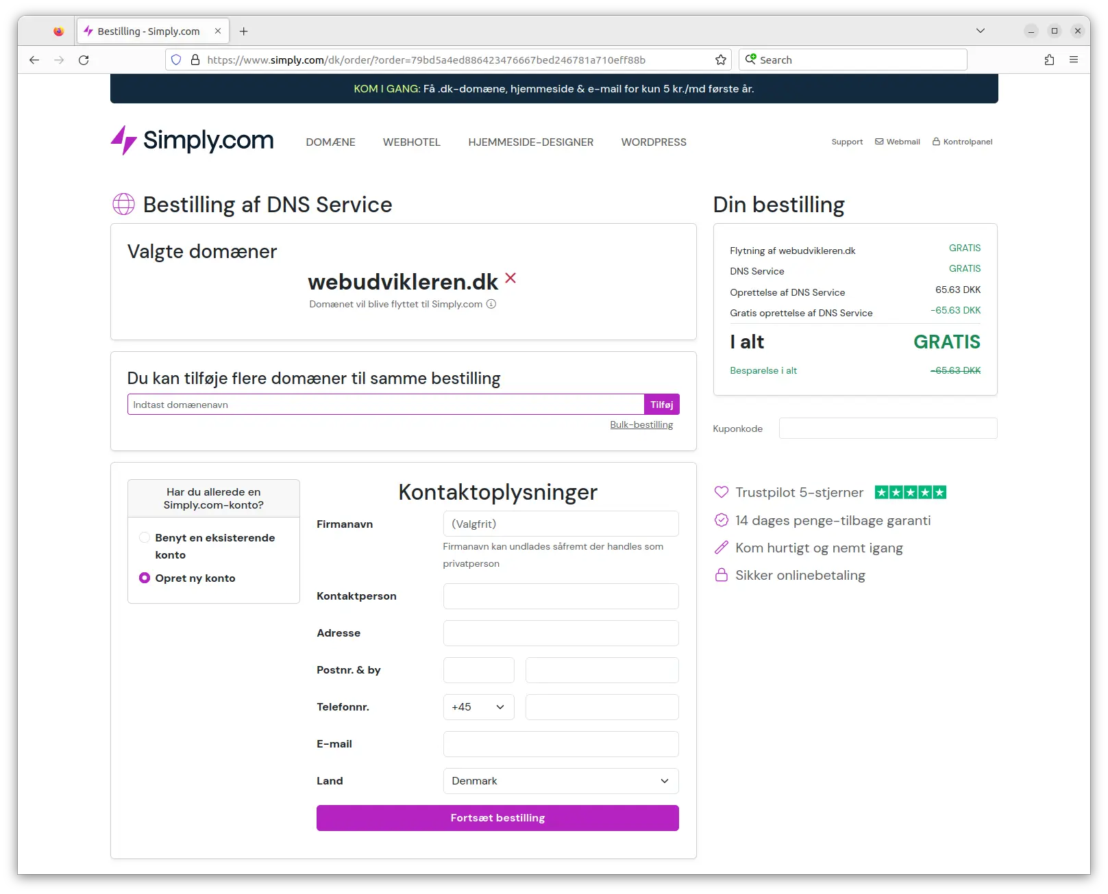 Du har formentlig ikke allerede en bruger hos Simply. Udfyld oplysningerne og tryk “Fortsæt bestilling”. I næste skærmbillede skal man indtaste kortoplysninger, og så er bestillingen gennemført.