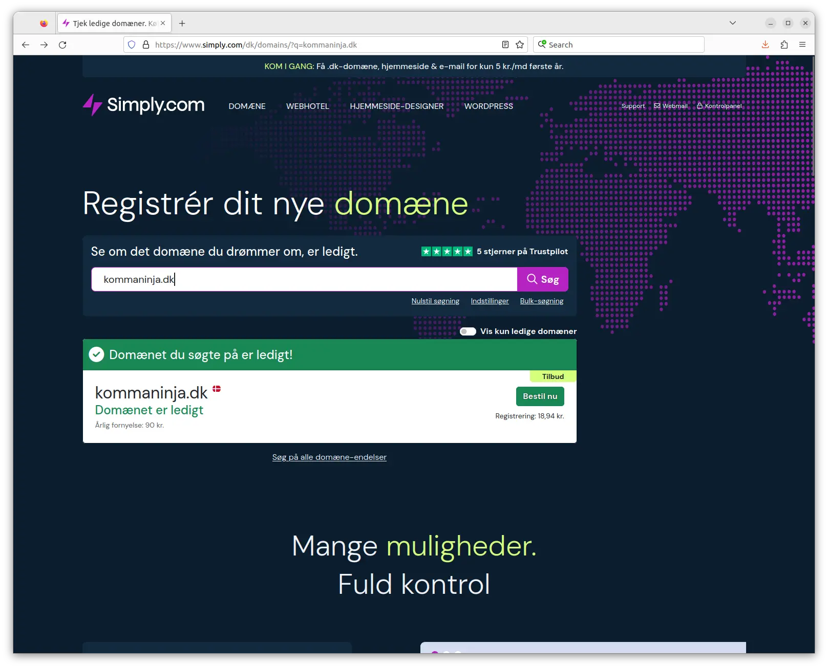 Gå til forsiden hos forhandleren (Simply.com) og indtast det ønskede domænenavn i søgefeltet.